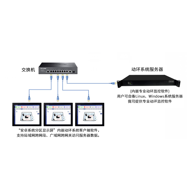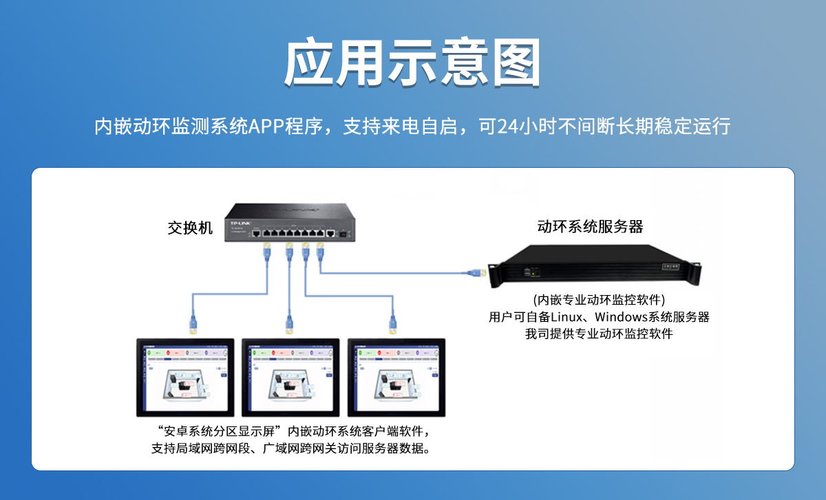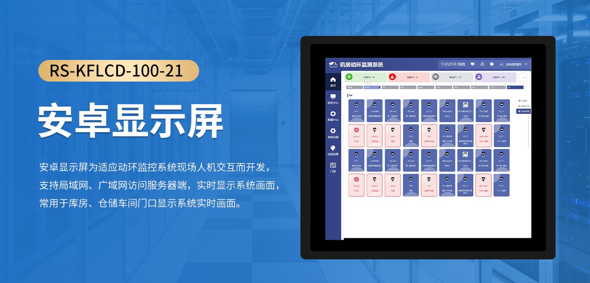安卓分區顯示屏為適應動環監控系統現場人機交互而開發,支持局域網、廣域網訪問服務器端,實時顯示系統畫面,常用于庫房、倉儲車間門口顯示系統實時畫面。內嵌動環監測系統APP程序,支持來電自啟,可24小時不間斷長期穩定運行。