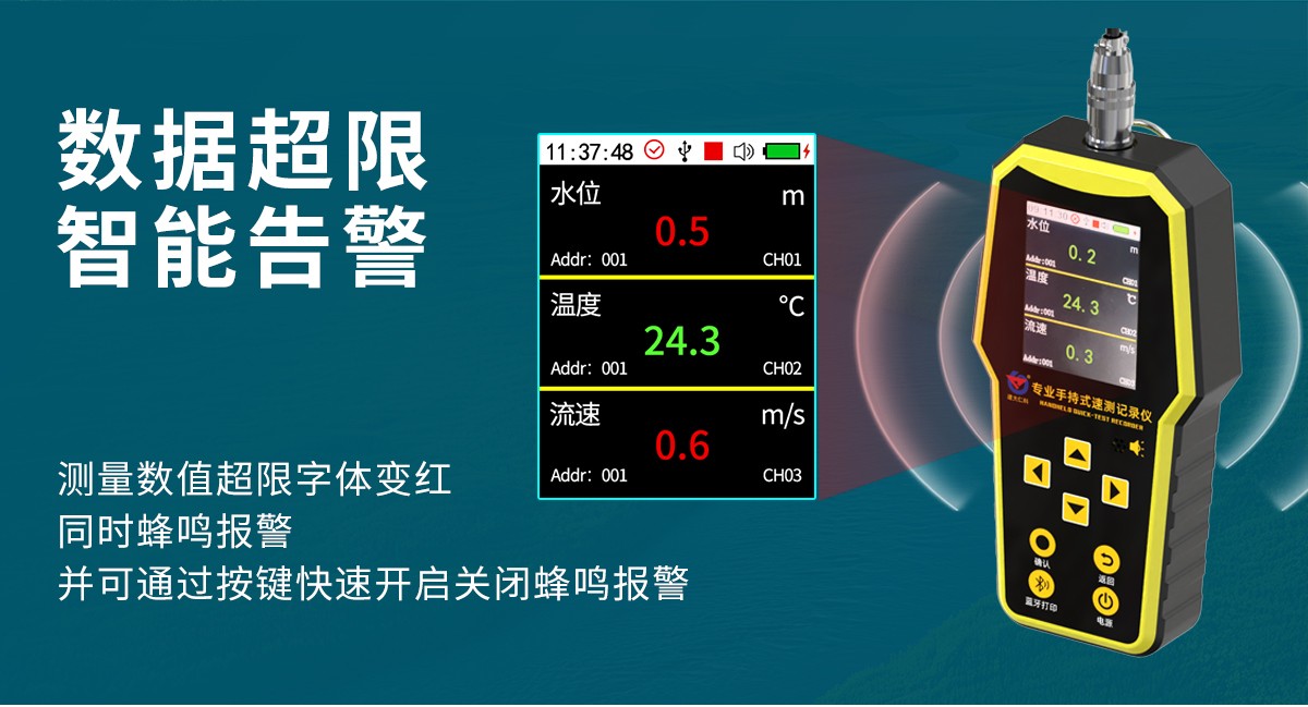 整套設備由手持式速測記錄儀主機、RS485多普勒流速儀從機、手提箱、探測桿、藍牙打印機組成。采用485通訊“一問一答”的組網方式,集數據觀測、記錄、分析為一體。