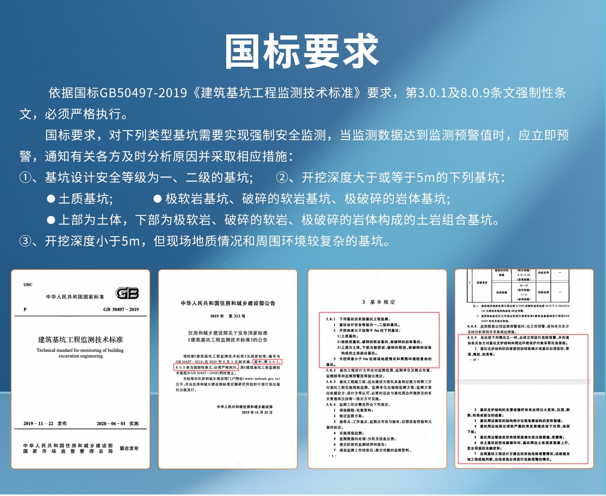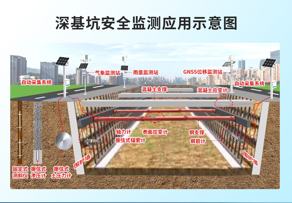 本方案依據國標要求,對基坑的支護結構受力情況、周圍土體位移沉降情況、地下孔隙水壓力情況進行全方位、高精度的實時在線監測。配合我司免費提供的監測預警平臺,賦予基坑安全在線監測系統全天候的守護能力以及智能預警機制,政府主管部門、安全監督機構、各責任主體單位,通過系統能夠及時查詢轄區內在建工程基坑現場的監測數據,實現動態監管目的。