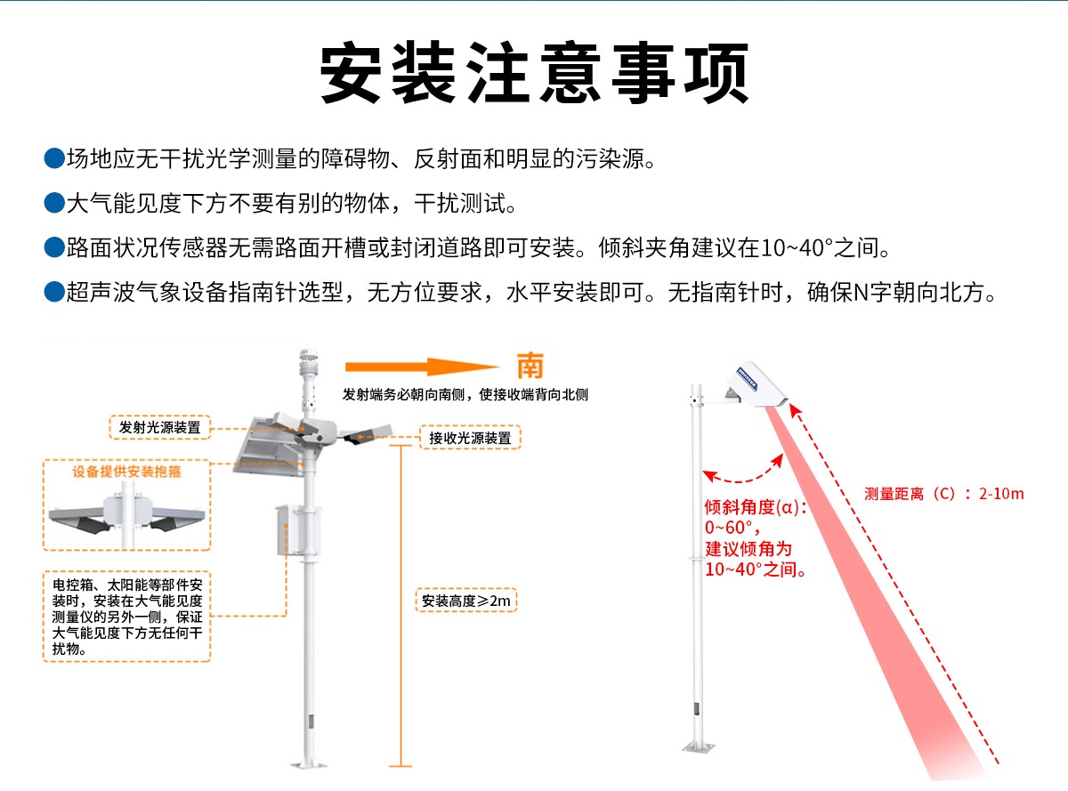 公路氣象站可以實現(xiàn)對惡劣天氣下高速公路環(huán)境進行診斷,能夠24小時連續(xù)采集大氣能見度、路面溫度、環(huán)境溫度、環(huán)境濕度、風(fēng)速、風(fēng)向、噪聲、PM2.5、PM10、二氧化碳、大氣壓力、光照等多個要素進行實時監(jiān)測,通過遠(yuǎn)程傳輸完成各類數(shù)據(jù)的匯總并及時傳輸至交通管理部門,為高速公路交通、施工作業(yè)、災(zāi)害預(yù)防等提供重要的參考依據(jù)。