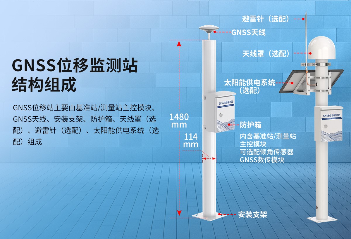GNSS位移監測站主要由GNSS天線、太陽能電池板、主控制機箱(內有主控傳輸模塊)和安裝支架組成。分為基準站和測量站,該設備可通過 4G、以太網兩種方式,將數據上傳至環境監控平臺,采用太陽能供電的方式,安裝不受地域地形的限制。