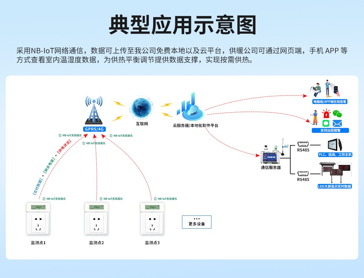 供暖溫濕度變送器是一款基于NB-IoT網絡由220V市電直接供電的低功耗物聯網溫濕度變送器,該溫濕度變送器精度高,并且具有穩定性好的優點。通過NB-IoT網絡上傳數據到我司免費云平臺或客戶自己的服務器,不僅可以在設備屏幕上實時查看當前室內溫濕狀態,也可以通過電腦端,手機APP等方式訪問云平臺輕松查詢和管理用戶室內溫濕度數據。