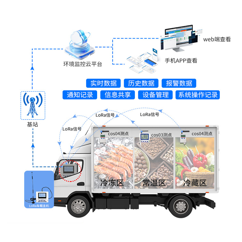 針對大型冷藏車,及車頭和車廂分開的冷藏車,推薦使用LORA無線車載主機搭配LORA無線溫濕度記錄儀進行監測。測點與主機之間采用LoRa無線的方式進行通訊,使用時主機安裝在駕駛室中,無線測點(1~4臺)通過磁吸/吊繩的形式安裝在車廂的任意多個點位進行監測,主機將接收的數據以4G的方式上傳至環境監控云平臺。