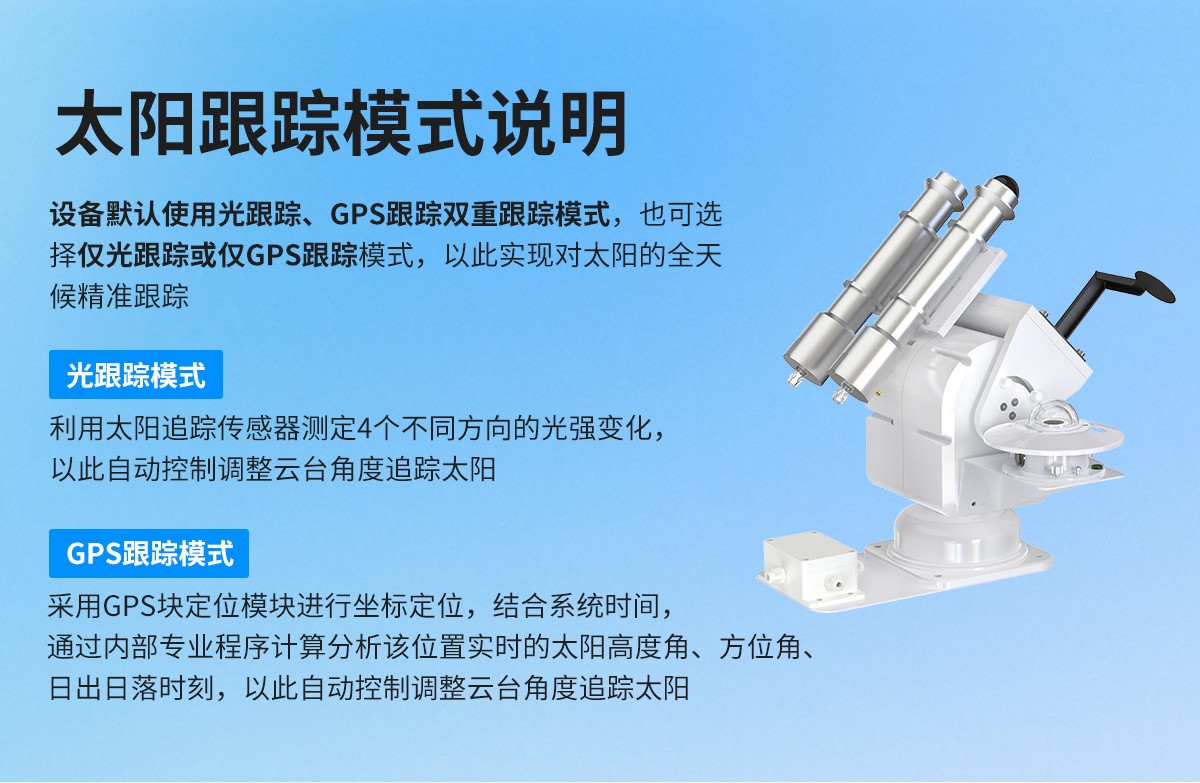 全自動太陽跟蹤輻射變送器是一款全自動無人值守自動跟蹤太陽進而測量多個太陽輻射參數的設備。設備采用太陽跟蹤(光追蹤)與GPS跟蹤雙重模式,可以自動計算太陽高度角與方位角、日出日落時間并計算分析比較太陽光強變化,進而精確的全天候跟蹤太陽。