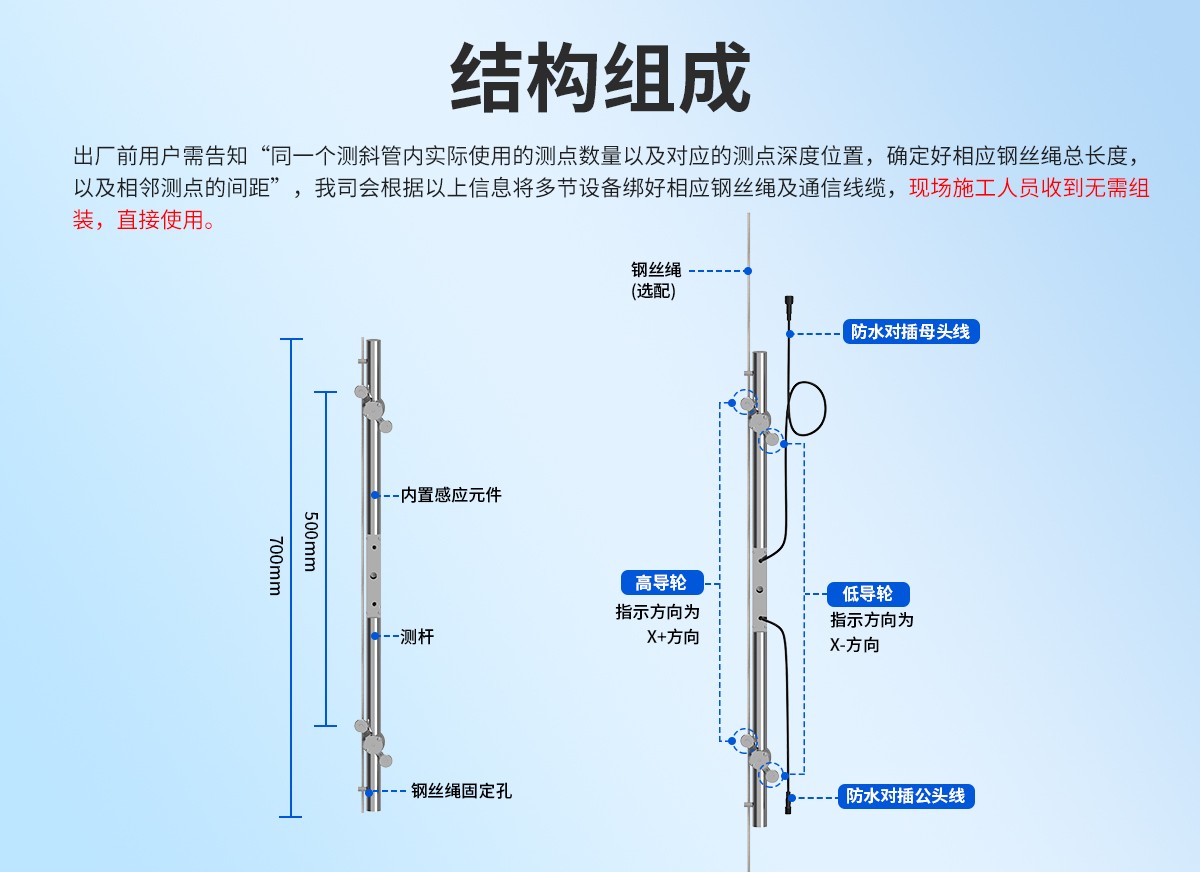 內(nèi)部位移監(jiān)測站以固定式測斜儀為核心,采用重力加速度傳感器作為敏感元件,測量精度高,能實現(xiàn)傾斜測量的自動化,在一個鉆孔內(nèi)安裝多個固定測斜儀,可以更加準(zhǔn)確的監(jiān)測傾斜變化,是一款工程施工監(jiān)測必備的精密測量儀器。