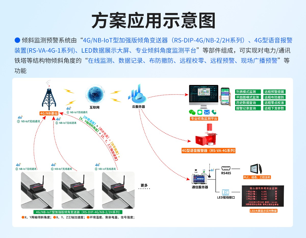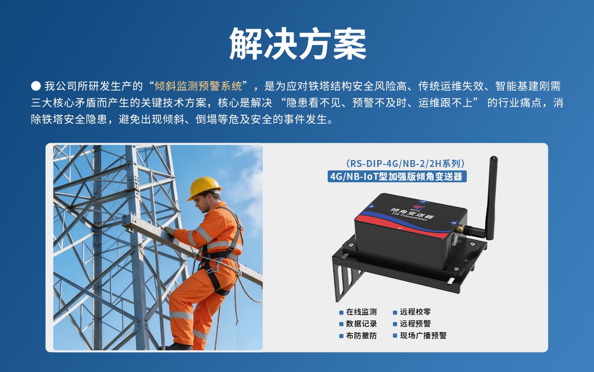 電力/通訊鐵塔傾斜監測預警系統,是為應對鐵塔結構安全風險高、傳統運維失效、智能基建剛需三大核心矛盾而產生的關鍵技術方案,核心是解決“隱患看不見、預警不及時、運維跟不上”的行業痛點,消除鐵塔安全隱患,避免出現傾斜、倒塌等危及安全的事件發生。