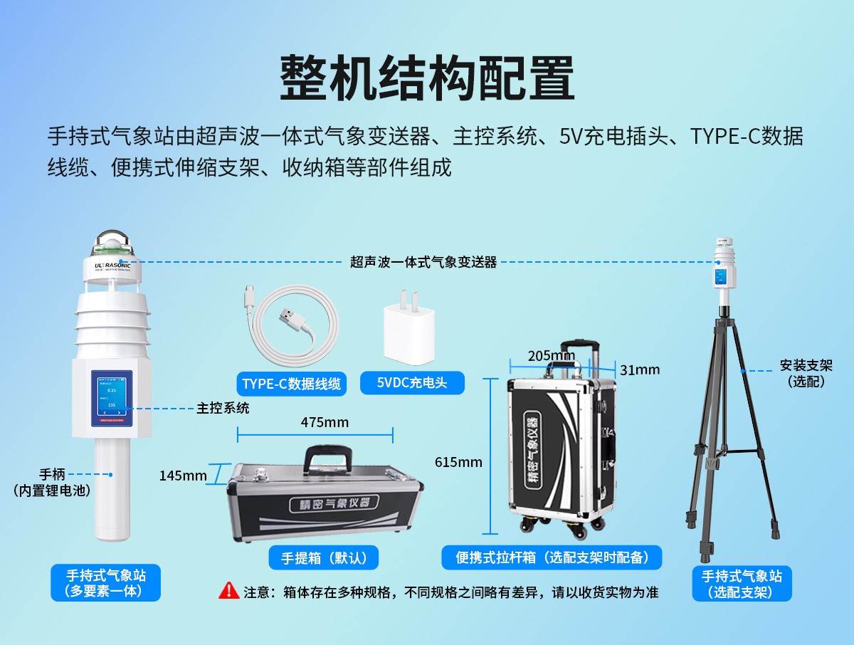 手持式氣象站是一款攜帶方便,操作簡單,集多項氣象要素于一體的可移動式氣象觀測儀器。能同時輸出風(fēng)速、風(fēng)向、溫度、濕度、氣壓、PM2.5、PM10、噪聲、二氧化碳、光學(xué)雨量、日照總輻射、海拔高度等實時數(shù)據(jù)。體積小、重量輕,便于攜帶和操作,能夠在各種環(huán)境下快速、準確地獲取并傳輸氣象數(shù)據(jù)。