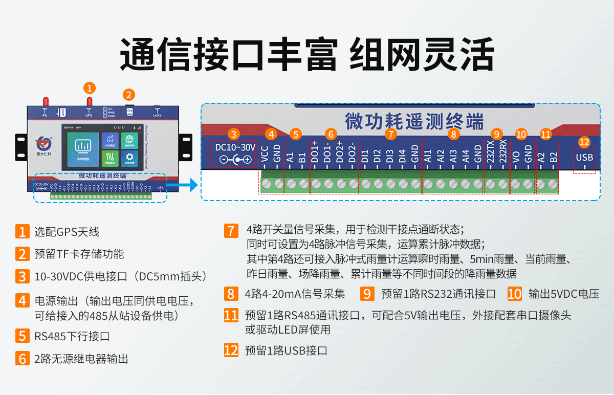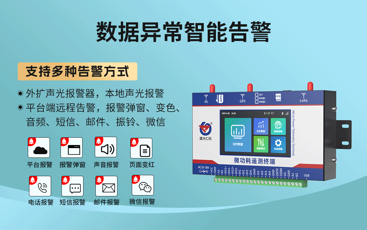 微功耗遙測終端專為環境監控系統“遠程數據采集與傳輸”設計的一款高效工業物聯網終端機,擁有豐富的下行通信接口,可兼容采集“多種類型終端傳感器”的測定數據