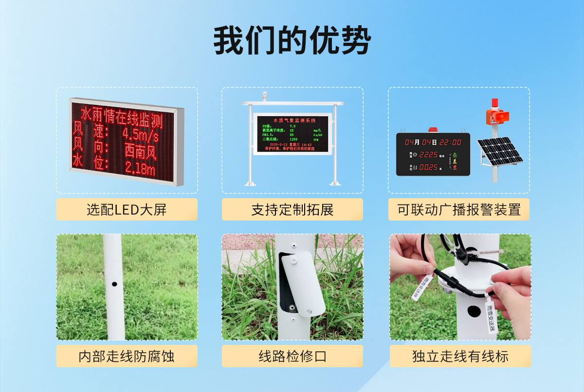 水雨情監測站對水位、總雨量、瞬時雨量、日雨量、當前雨量等要素及現場圖像視頻進行全天候采集,支持無線和有線等多種網絡通訊方式進行數據傳輸,將數據傳輸至環境監控云平臺中,用于水雨情的統計分析和處理。具有自動氣象監測、實時數據顯示、實時圖像顯示、智能遠程管理、數據分析存儲等功能。