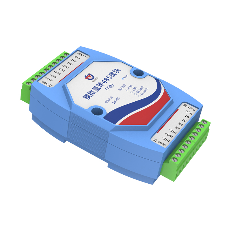 該模塊可采集現場的最多 7 路模擬量信號(4-20mA、0-20mA、0-5V、1-5V),并通過 485 接口標準 ModBus-RTU 通信協議上傳。可直接接入現場的 PLC、工控儀表、組態屏或組態 軟件。采集精度 12 位分辨率,0.1% 典型精度。