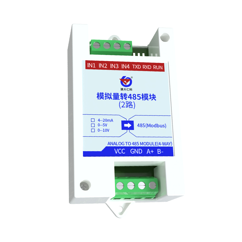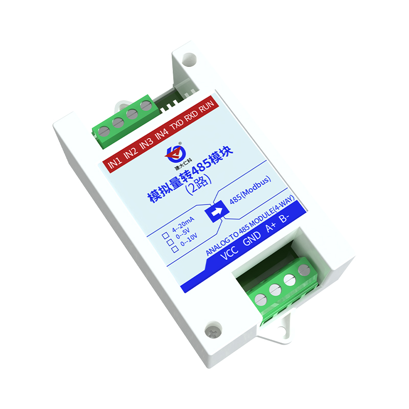 該模塊可采集現場的最多兩路模擬量信號(4-20mA、0-10V、0-5V)并轉為485接口標準ModBus-RTU 通信協議上傳。485接口最遠通信距離2000米,可直接接入現場的PLC、工控儀表、組態屏或組態軟件。
