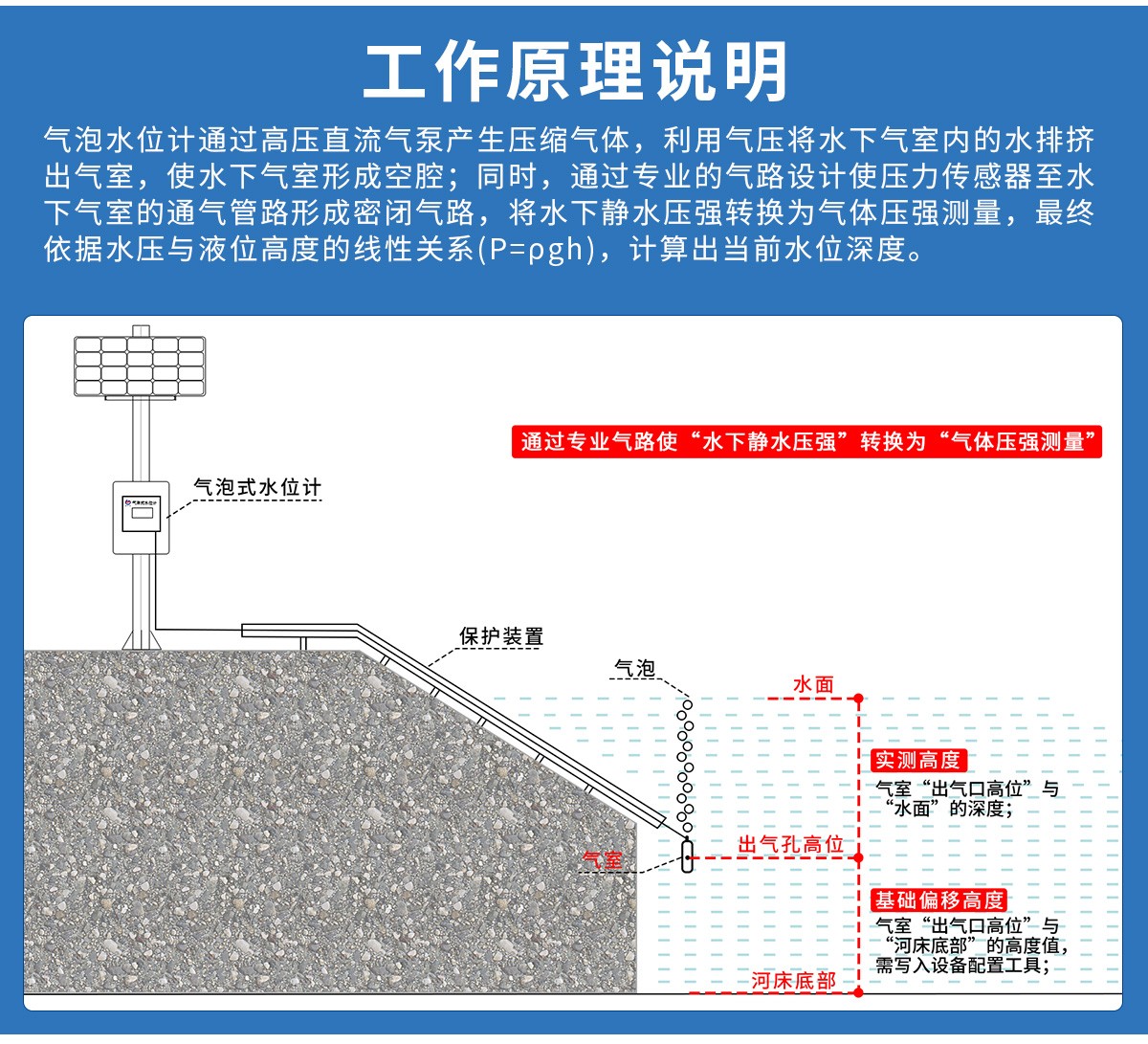 氣泡式水位計基于高精度壓力傳感器以及專業氣動控制回路,使水下靜水壓強轉換為氣體壓強測量,解決傳統投入式液位計因直接接觸液體而存在的易受液體沖擊、易腐蝕結垢、易損壞、易受泥漿堵塞、需定期維護等問題。