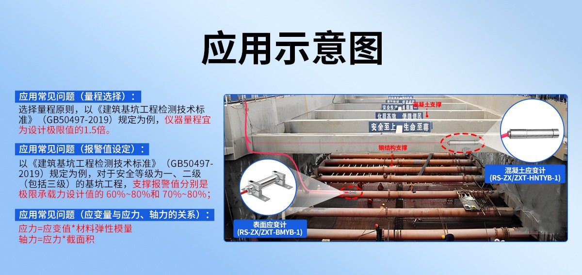 振弦式應變計可長期埋沒于“支護結構物內部”或固定于“支護結構物表面”測量支護結構物的應變量,加裝配套附件可組成多向應變計組、無應力計、巖石應變計。若加裝溫度傳感器即可同步測量安裝點的溫度,搭配我公司振弦式傳感器采集器可實現對現場傳感器實時數據進行采集并轉換 485/4G/NB/LoRa 等數據傳輸方式上傳。